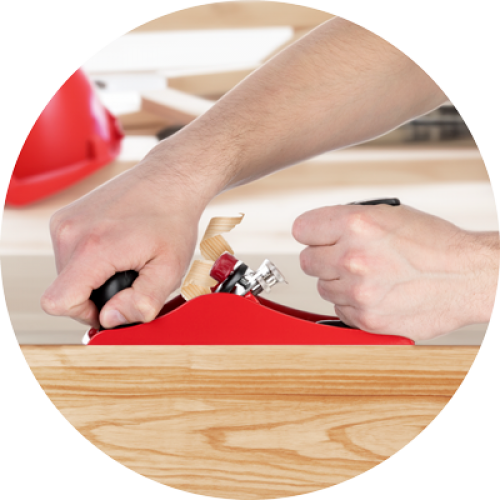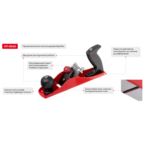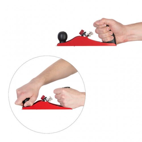 Рубанок имеет регулировочный винт для настройки глубины строгания. Также оснащен двумя ручками удобной формы для более надежного удержания инструмента в руках.